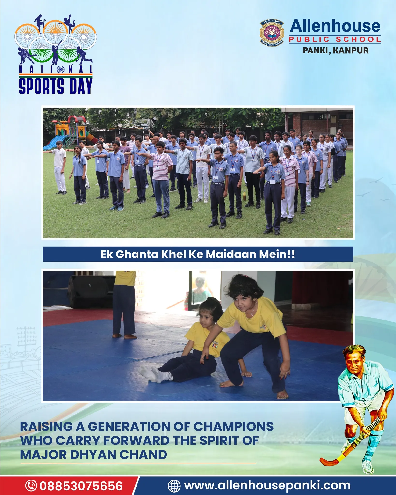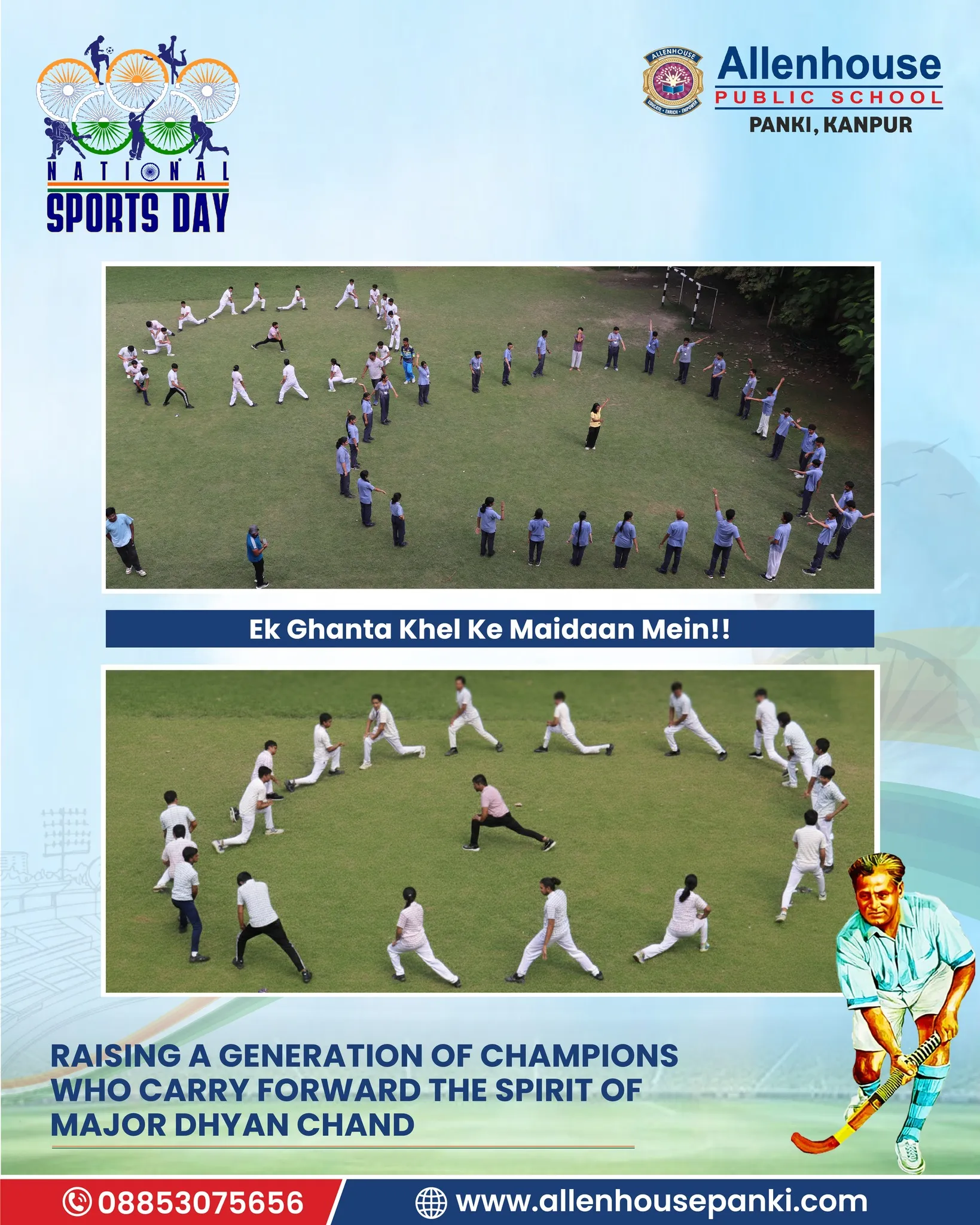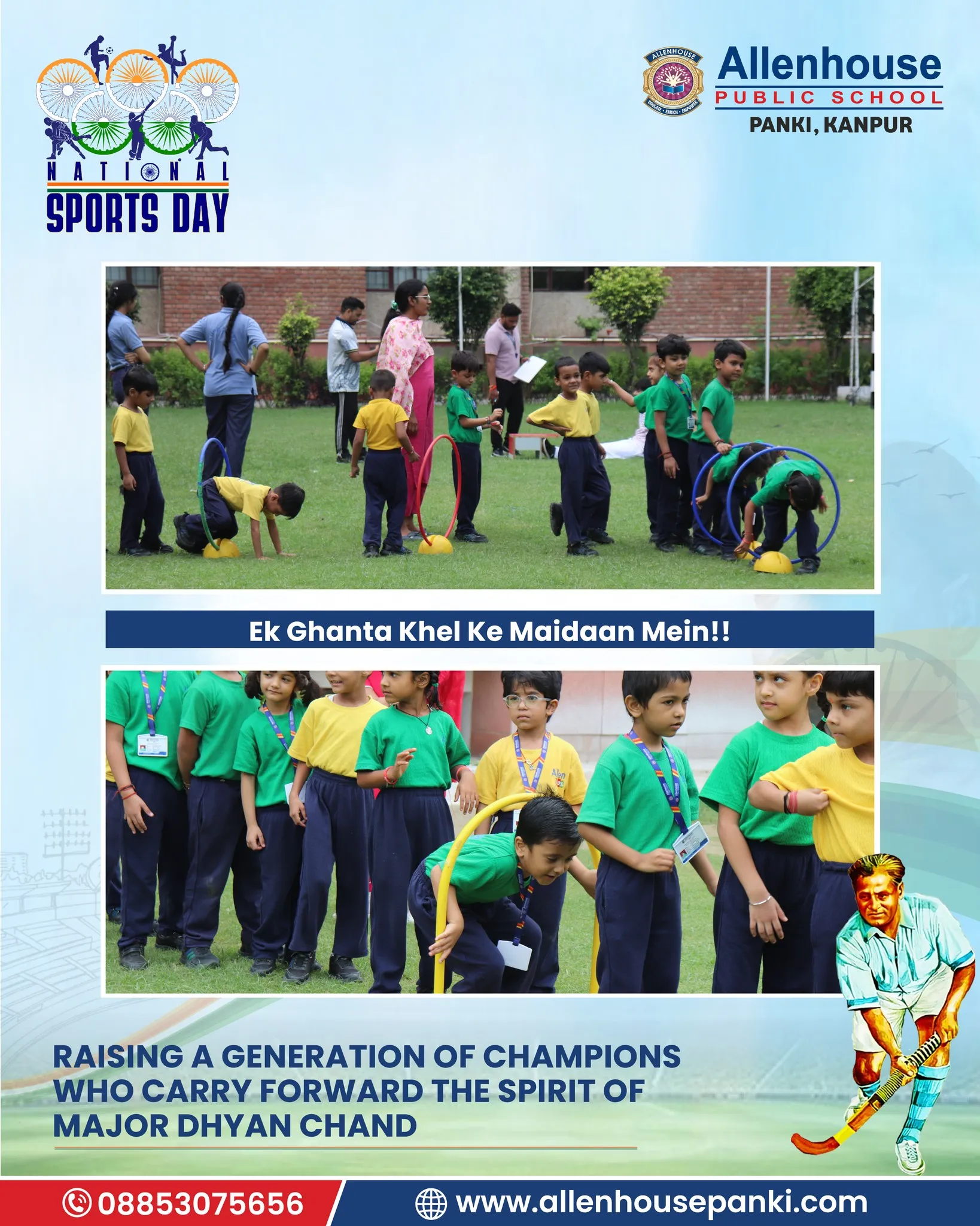 On the occasion of National Sports Day and in tribute to the Hockey Maestro, Major Dhyan Chand, Allenhouse Public School, Panki organized a series of sports activities to inspire and energize young minds. The celebration echoed the spirit of “Ek ghanta khel ke maidan mein!!”, encouraging students to dedicate an hour to the sports field.