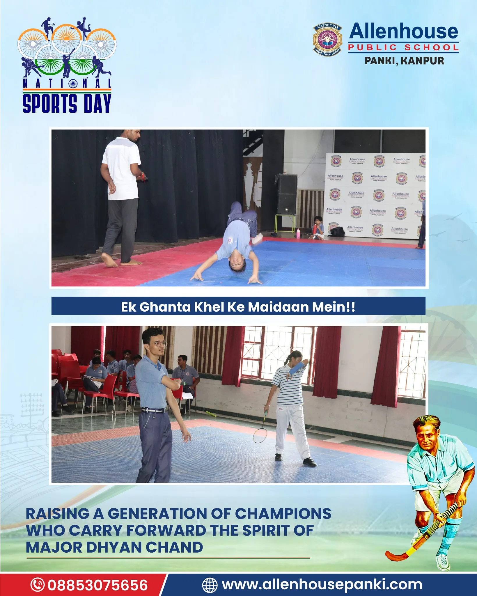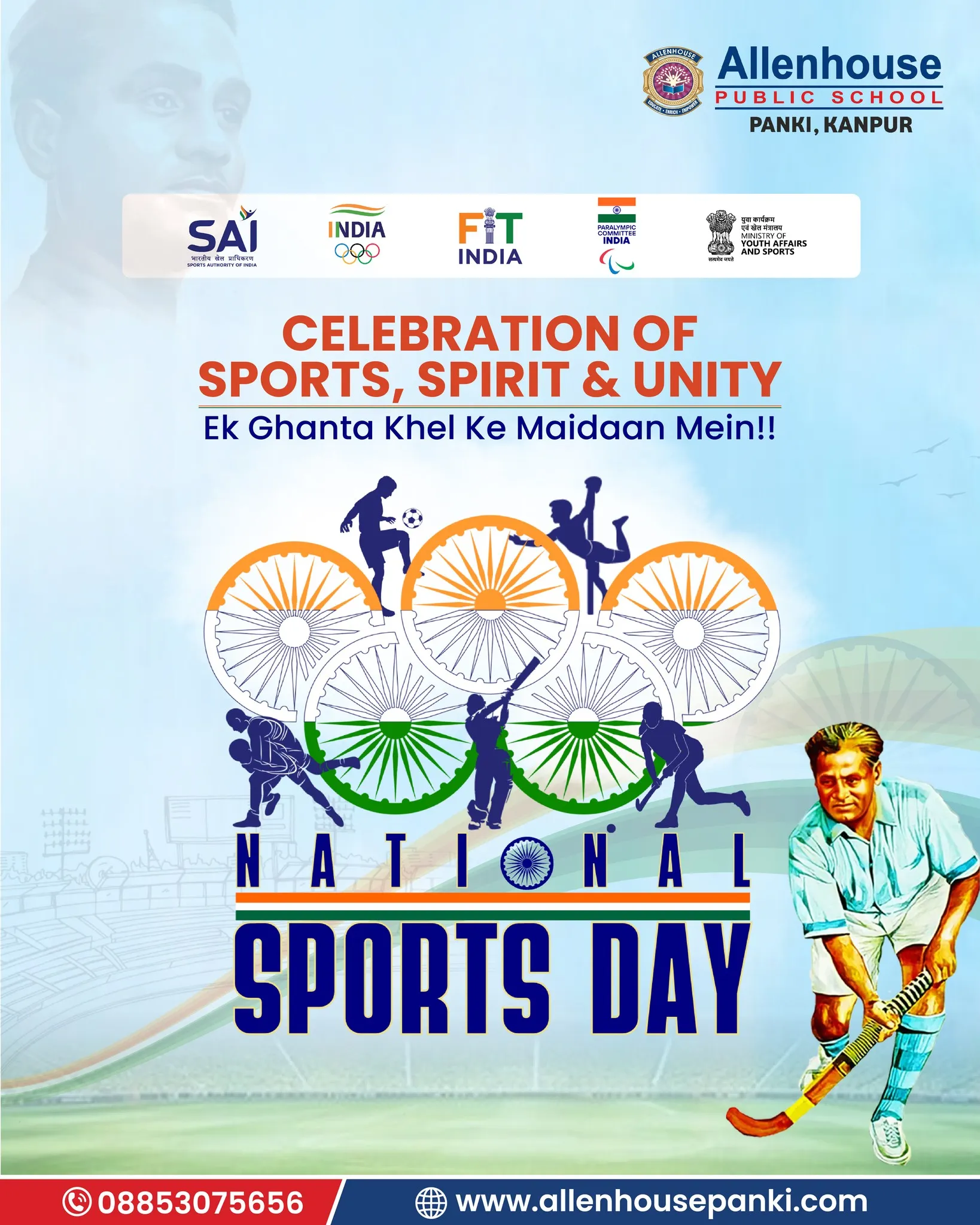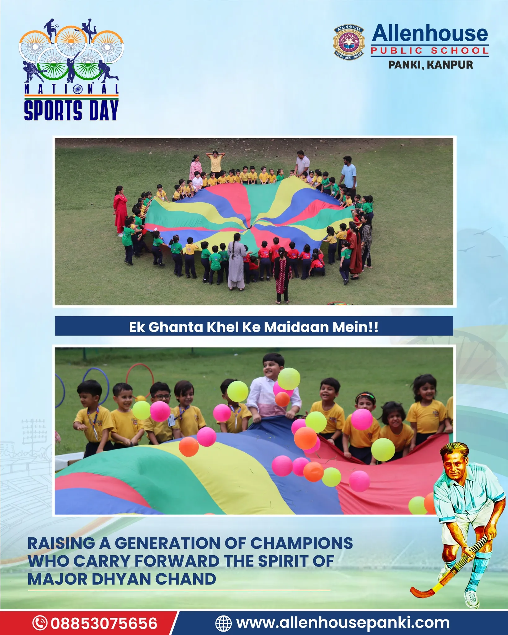 On the occasion of National Sports Day and in tribute to the Hockey Maestro, Major Dhyan Chand, Allenhouse Public School, Panki organized a series of sports activities to inspire and energize young minds. The celebration echoed the spirit of “Ek ghanta khel ke maidan mein!!”, encouraging students to dedicate an hour to the sports field.
